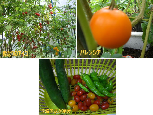 昨日のトマトハウスの画像です。 アイコが鈴なりに沢山出来てましたので大量収穫♪ 変り種として、バレンシアというトマトですが まるでオレンジのように丸くって大きいトマトも 出来ました。