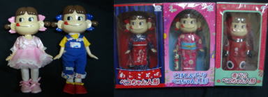 左から「夢みるペコちゃんバレリーナ」 「懸賞マイルーム、ウィズペコちゃん」 右3体「懸賞、東北紀行ペコちゃん」