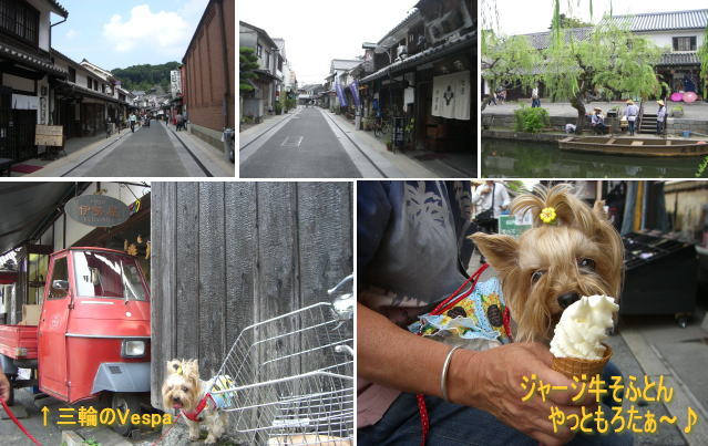 山陽堂さんを後に、倉敷美観地区に行くためアイビースクウェアに戻ってみると、イベントが開催されて いました。岡山のお土産やアーティスさんの工芸品の販売や軽食がありました。 まだ昼食には早いので、アイビースクウェアを通り抜け、美観地区観光に出かけました。 むむっ、何となーく伊勢のおかげ横丁と似た地区もあったり、倉敷の古い建物と風情を 楽しませていただきました♪ 手漕ぎ船、乗ってみたかったけど、ワンコ×なので残念でした。川の中を覗いてみると大きな鯉が沢山 泳いでいたのは凄かったが、もっと面白かったのは川の淵に出店があって、川横に店主さんの顔が出て いるのにビックリでした(;^_^A つまり川の土手の石畳に座られているのでパッちゃん目線に顔が出ているのぉ