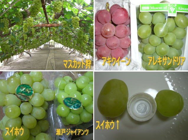 そんな事で、マスカットの聖地に行って食べてきました〜♪ 勿論、マスカットだけでなく、アレキサンドリア、 スイホウ(種なし)瀬戸ジャイアント(種なし)